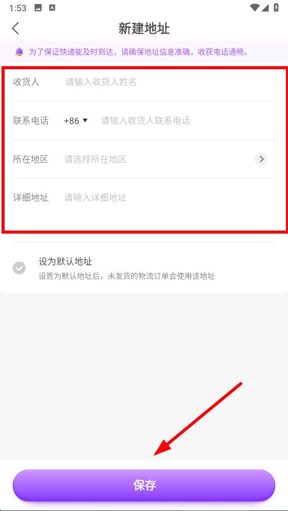 5、按提示填寫收貨人姓名、聯(lián)系電話、所在地區(qū)和詳細(xì)地址后,點(diǎn)擊保存即可。