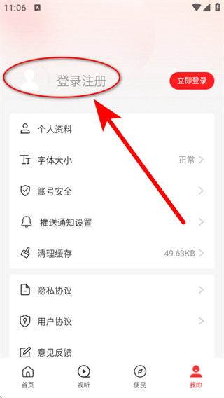 2、在個人的頁面,我們需要點擊登錄注冊按鈕,進(jìn)入登錄的頁面。