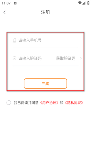 4、在注冊頁面輸入手機(jī)號,獲取并填寫驗證碼,點擊完成完成注冊操作。