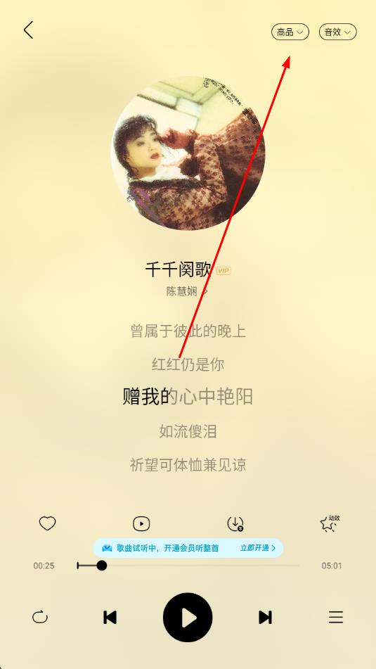 4、設(shè)置完成后,播放歌曲時,點擊歌曲播放頁面右上角的高品按鈕,可查看當(dāng)前音質(zhì)設(shè)置。