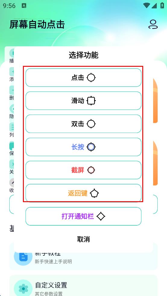 4、在“選擇功能”窗口中,有“點擊”“滑動”“雙擊”“長按”“截屏”“返回鍵”等多種功能選項,根據(jù)需求點擊相應的功能選項即可完成選擇。