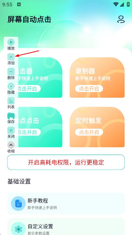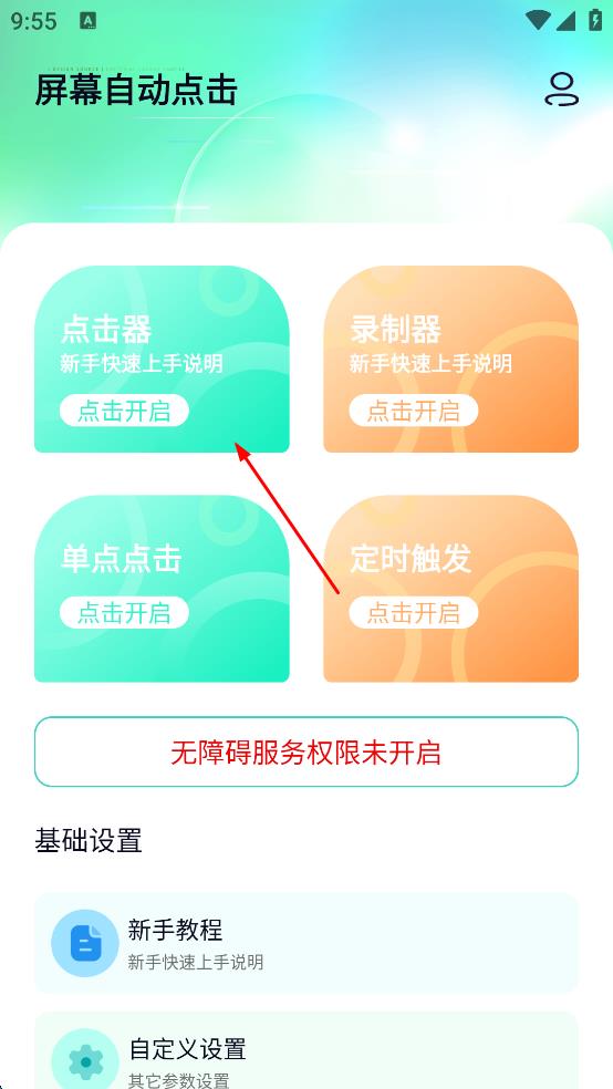 2、進入屏幕自動點擊主界面后,在界面中找到“點擊器”區(qū)域,點擊“點擊開啟”按鈕,此時會彈出相關操作選項欄。