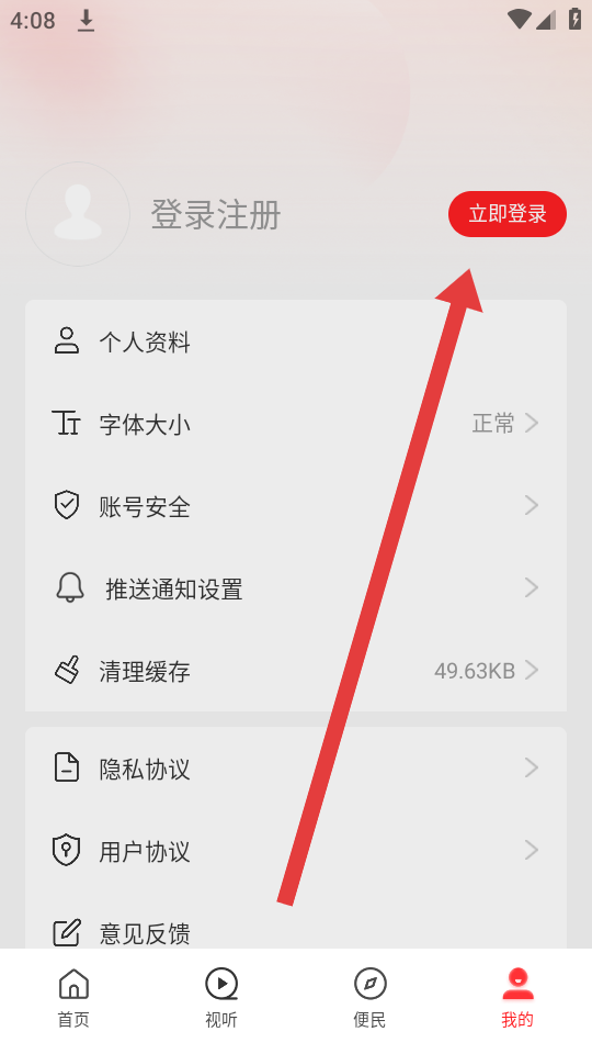 1、打開(kāi)云上獲嘉APP,點(diǎn)擊底部導(dǎo)航欄的我的進(jìn)入個(gè)人頁(yè)面,再點(diǎn)擊頁(yè)面右上角紅色的立即登錄按鈕,進(jìn)入登錄界面。