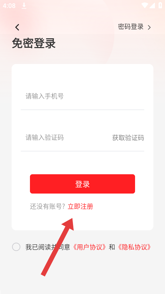 2、在登錄的界面免密登錄頁(yè),點(diǎn)擊還沒(méi)有賬號(hào),立即注冊(cè)的紅色文字鏈接,跳轉(zhuǎn)至注冊(cè)頁(yè)面。
