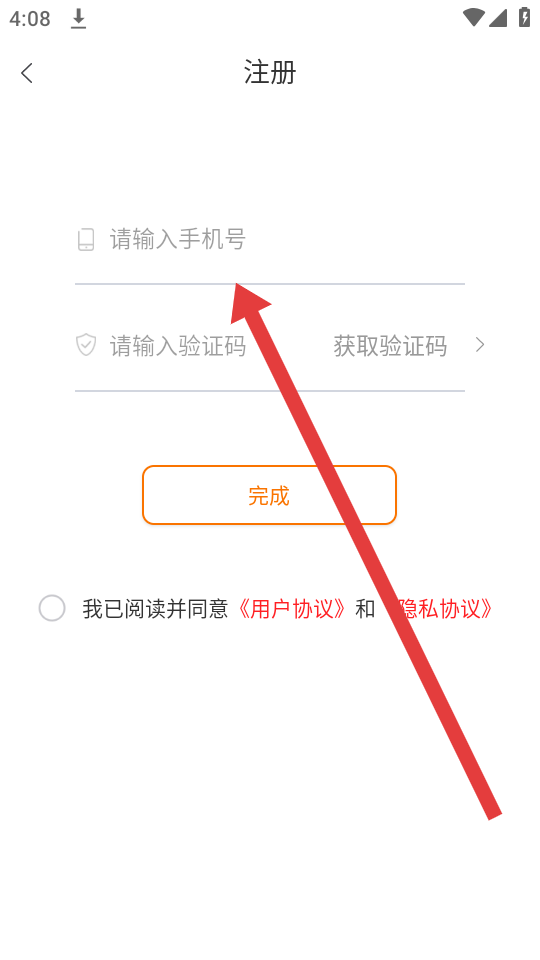 3、在注冊(cè)頁(yè)面,依次輸入手機(jī)號(hào)碼,點(diǎn)擊獲取驗(yàn)證碼并填寫(xiě)收到的驗(yàn)證碼,勾選我已閱讀并同意協(xié)議,最后點(diǎn)擊完成按鈕,即可完成注冊(cè)。