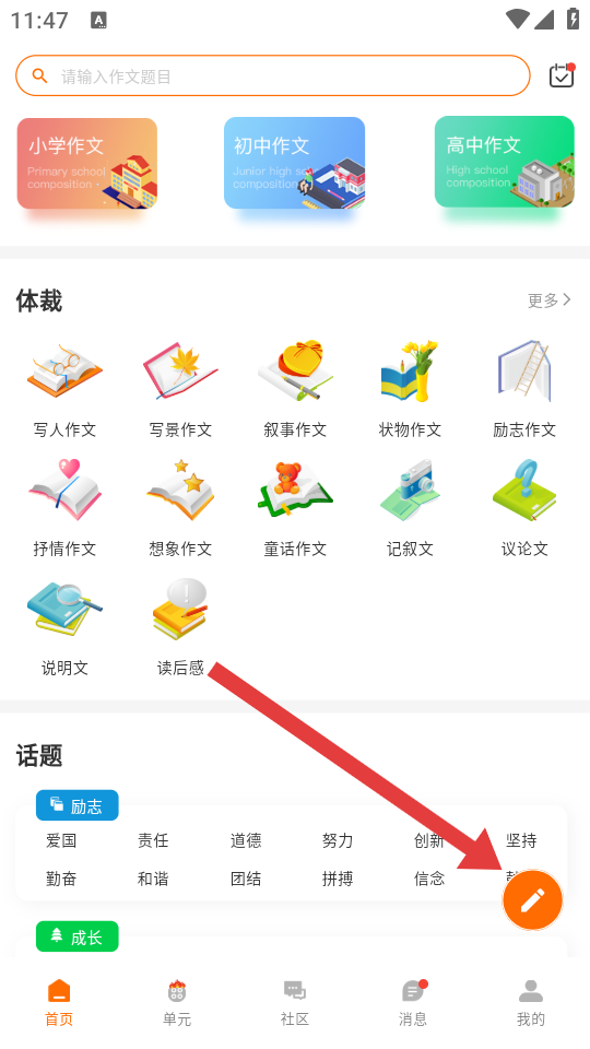 1、在作文吧APP首頁,點擊右下角帶筆圖標的按鈕,進入作文投稿頁面。