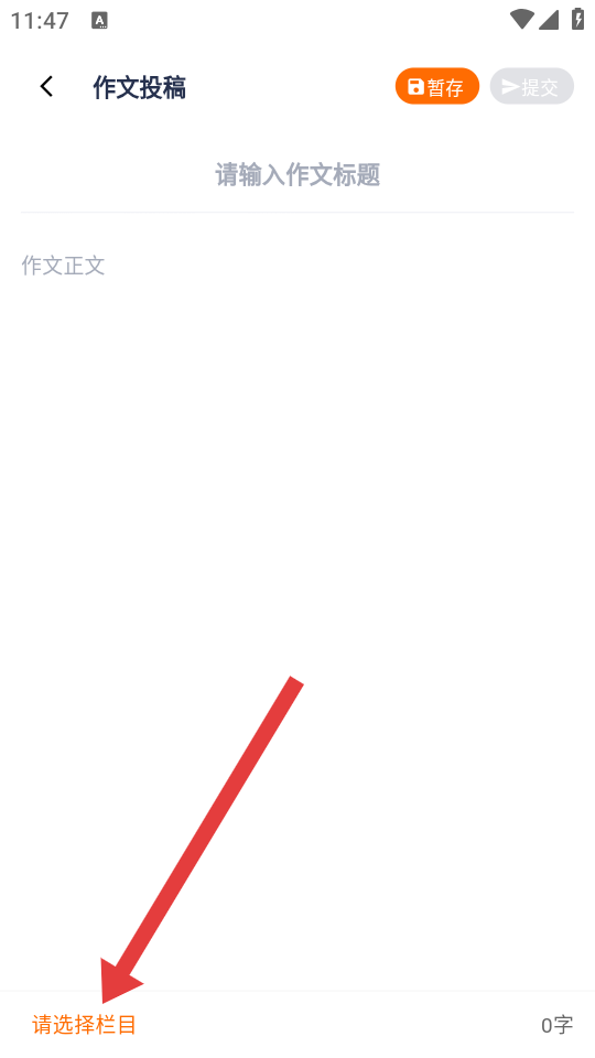 2、在作文投稿頁面輸入作文標題與正文后,點擊左下角請選擇欄目。
