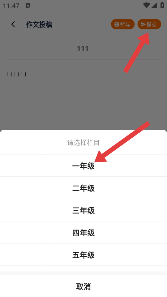3、在彈出的年級選擇列表里選好對應年級,再點擊右上角提交按鈕。