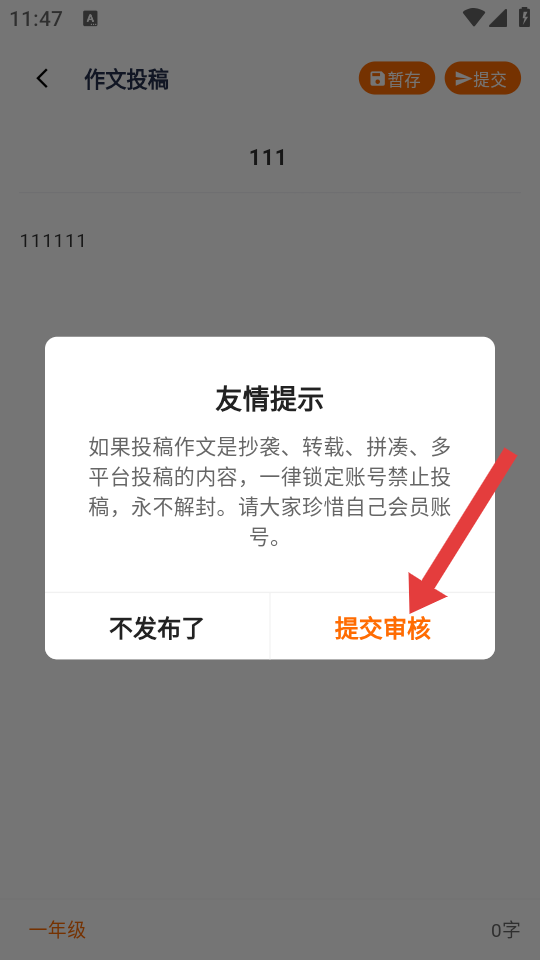 4、在彈出的友情提示框中,點擊提交審核,完成作文投稿操作。