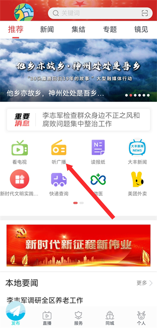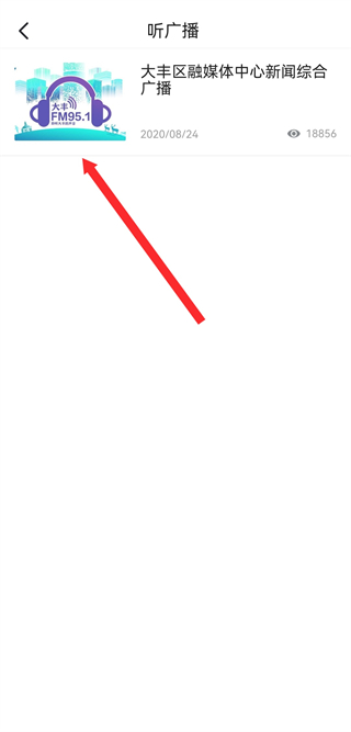 1、打開智慧大豐APP首頁,點(diǎn)擊聽廣播選項(xiàng),進(jìn)入聽廣播板塊頁面。