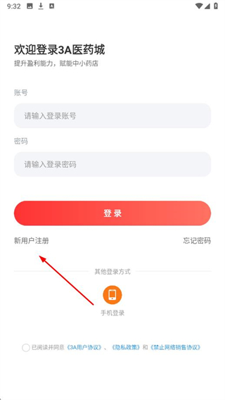 1、打開3A醫(yī)藥城APP,在登錄頁(yè)面點(diǎn)擊新用戶注冊(cè)。