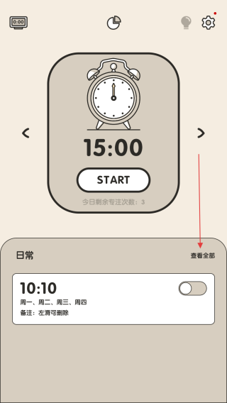 1、打開專注鬧鐘應用,在主界面點擊日常板塊右側(cè)的查看全部,進入我的日常頁面。