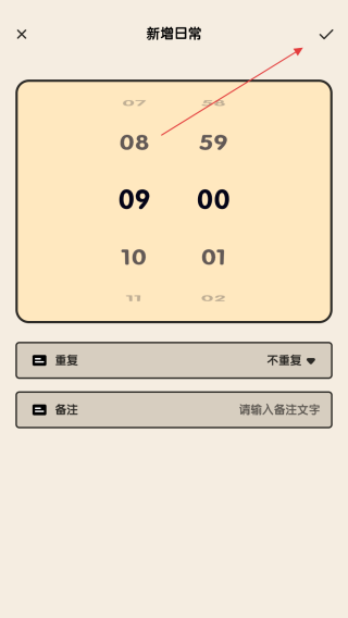 3、在新增日常界面,設(shè)置好鬧鐘時間,然后點擊右上角的對勾圖標,確認新增日常鬧鐘。