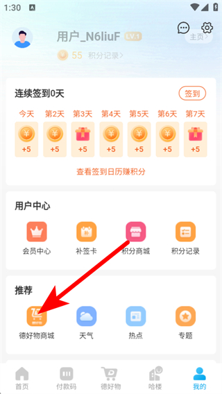 2、在個人的頁面,點擊德好物商城按鈕,進入商城的頁面。