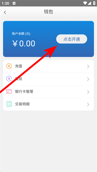 4、在錢包的頁面,點擊賬戶余額旁的點擊開通,完成共享錢包開通操作。