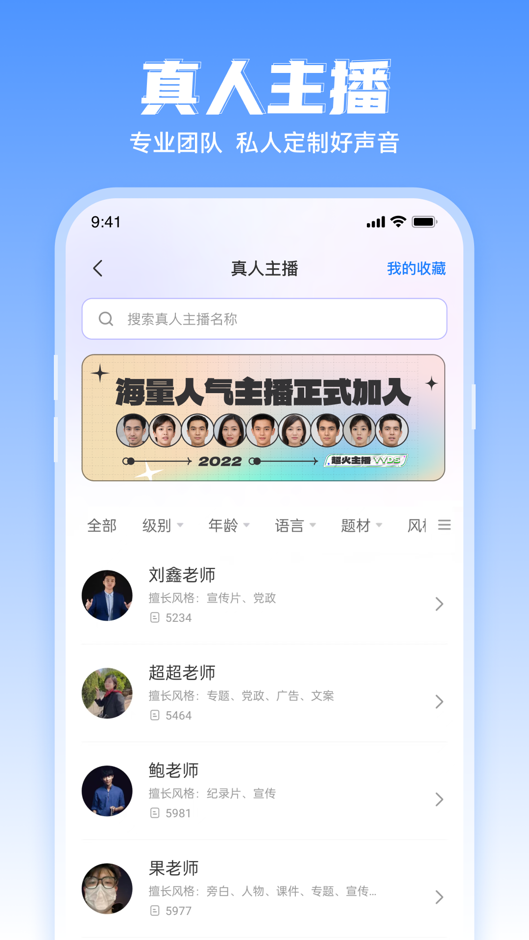 2、擁有多種不同的主播,讓用戶隨時(shí)在線選擇最佳的主播進(jìn)行轉(zhuǎn)換配音。