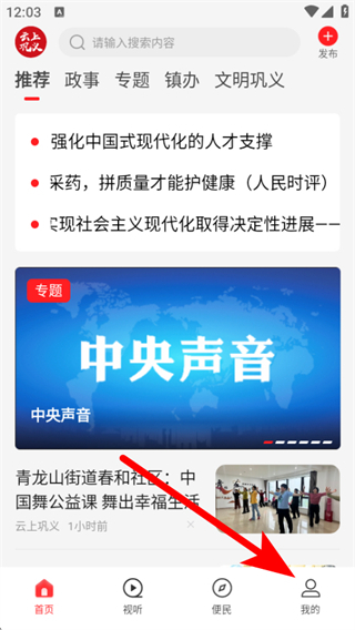 1、打開云上鞏義app,在首頁點擊底部我的,進入個人的頁面。
