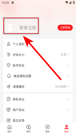 2、在個人頁面點擊登錄注冊的區(qū)域,進入免密登錄的界面。