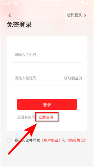 3、在免密登錄的界面點擊立即注冊的按鈕,進入注冊的頁面。