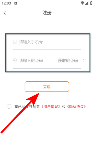 4、在頁面輸入手機號和驗證碼后點擊完成,完成賬號注冊操作。