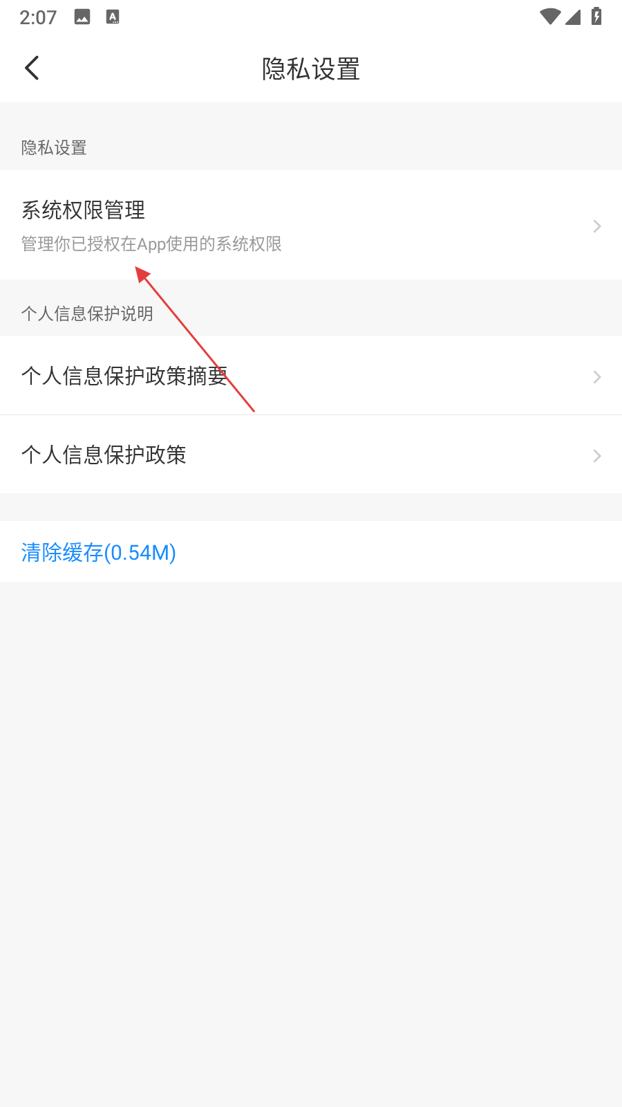3、進(jìn)入隱私設(shè)置頁面后,點(diǎn)擊系統(tǒng)權(quán)限管理選項(xiàng)。
