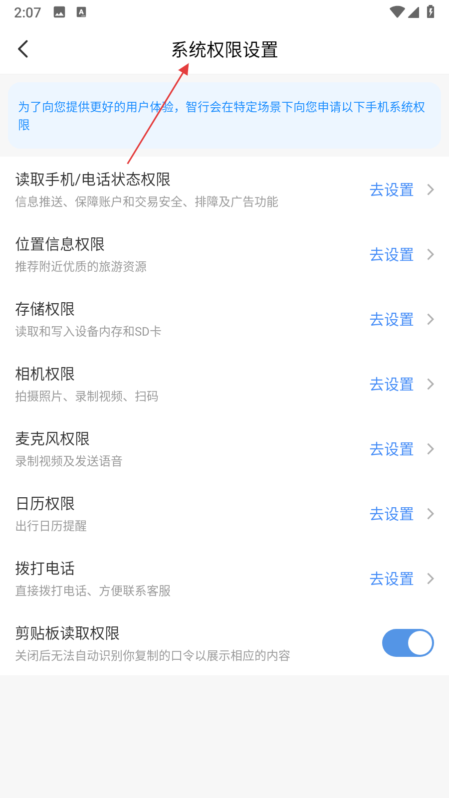 4、在系統(tǒng)權(quán)限設(shè)置頁面,可看到各類系統(tǒng)權(quán)限,點(diǎn)擊對(duì)應(yīng)權(quán)限右側(cè)的去設(shè)置,即可進(jìn)入手機(jī)系統(tǒng)設(shè)置界面,對(duì)該權(quán)限進(jìn)行開啟或關(guān)閉。