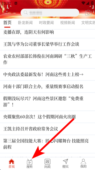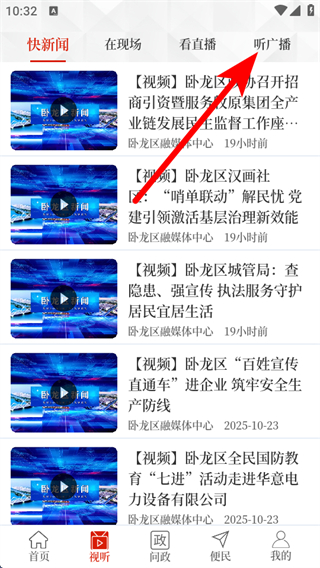 1、打開(kāi)云上臥龍APP首頁(yè),點(diǎn)擊底部視聽(tīng),進(jìn)入視聽(tīng)的板塊。
