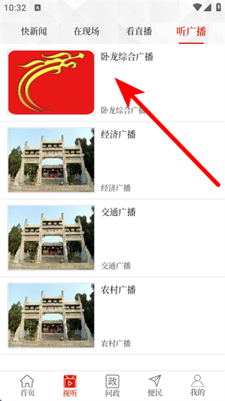 3、在廣播列表中選擇目標(biāo)頻道如臥龍綜合廣播,點(diǎn)擊進(jìn)入頻道頁(yè)面。