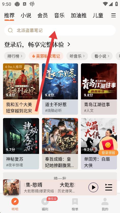 1、打開懶人暢聽app,在首頁上方的搜索欄中。