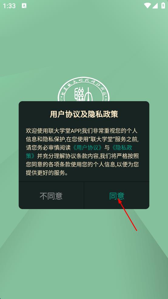 1、打開聯(lián)大學(xué)堂APP,會彈出用戶協(xié)議及隱私政策頁面,仔細閱讀后點擊同意按鈕。