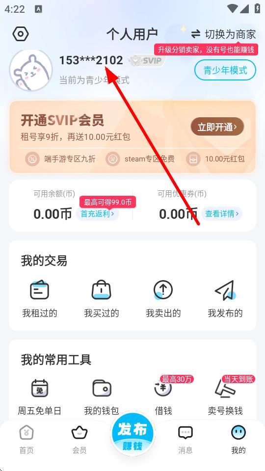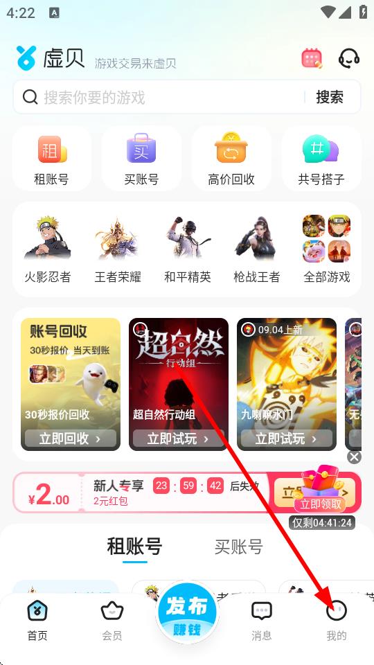 1、打開(kāi)虛貝租號(hào)app,點(diǎn)擊底部導(dǎo)航欄中的我的選項(xiàng)。