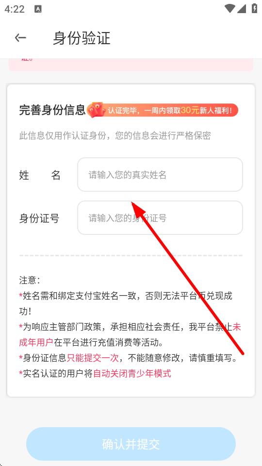4、在身份驗(yàn)證頁(yè)面,輸入真實(shí)姓名和身份證號(hào),點(diǎn)擊確認(rèn)并提交完成實(shí)名認(rèn)證。