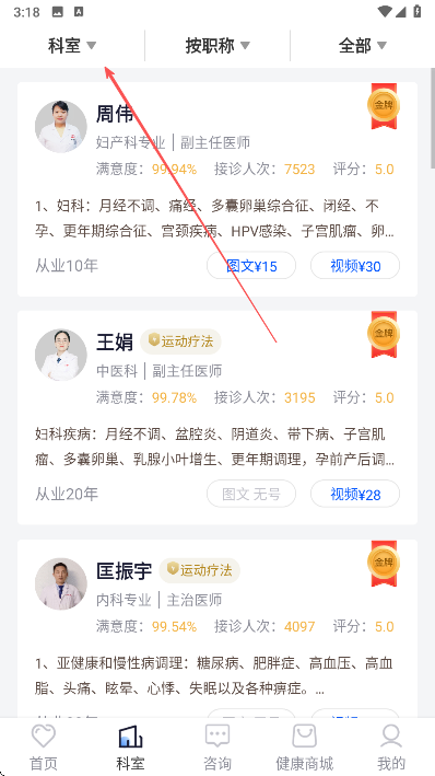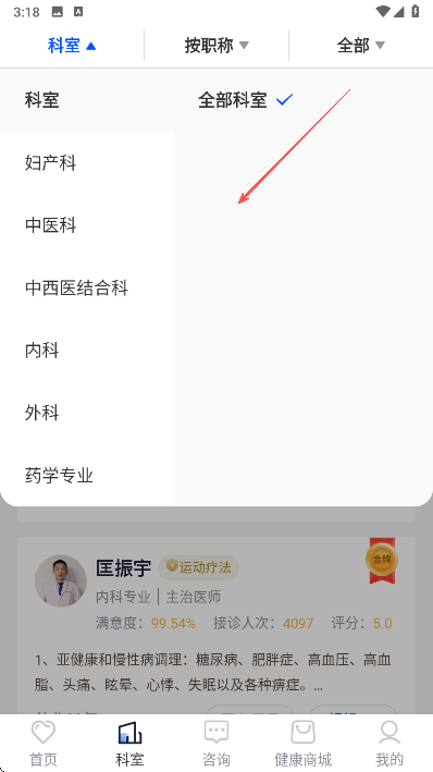 1、打開谷醫(yī)堂健康A(chǔ)PP,進(jìn)入首頁后,點(diǎn)擊底部菜單欄中的科室選項(xiàng),進(jìn)入科室頁面。