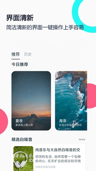 1、內(nèi)容豐富:擁有睡眠,放松,冥想,兒童等豐富種類的已制作好的白噪音超多聲音中總有一款是您想要的。