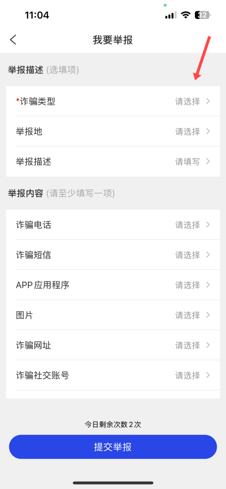 2、進(jìn)入舉報頁面后,可選擇詐騙類型,填寫舉報地、詳細(xì)的舉報描述、詐騙電話、短信、APP應(yīng)用程序、圖片、網(wǎng)址、社交賬號等信息,提交舉報。