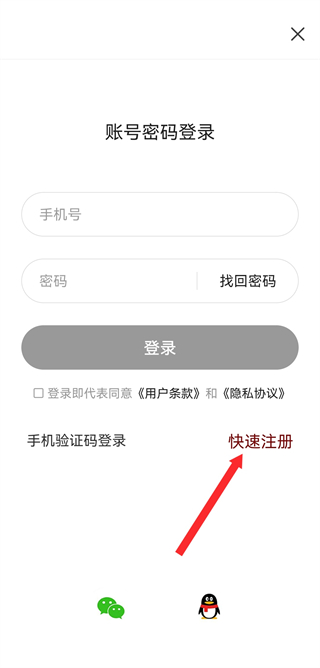 3、在登錄注冊的界面,點擊快速注冊,進入注冊的頁面。