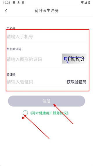 2、在荷葉醫(yī)生注冊(cè)頁(yè)面,輸入手機(jī)號(hào),輸入圖形驗(yàn)證碼,填入短信驗(yàn)證碼,勾選用戶(hù)協(xié)議,點(diǎn)擊注冊(cè)。
