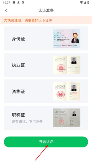 3、準(zhǔn)備好身份證、執(zhí)業(yè)證、資格證,點(diǎn)擊開(kāi)始認(rèn)證,即可設(shè)置賬號(hào)密碼并正常使用。