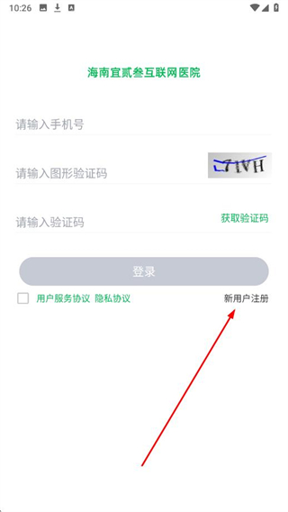 1、打開(kāi)荷葉醫(yī)生APP,在登錄頁(yè)面點(diǎn)擊新用戶(hù)注冊(cè)。