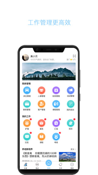 云齡養(yǎng)老是一款能夠幫助養(yǎng)老機(jī)構(gòu)進(jìn)行高效高質(zhì)量的管理并實(shí)施養(yǎng)老服務(wù)的軟件。機(jī)構(gòu)人員實(shí)用軟件可以快速的查看最新消息以及自己的工作任務(wù),同時(shí)了解老人的情況,有事情還可以在軟件上快速溝通,能夠讓養(yǎng)老服務(wù)的質(zhì)量更上一層樓。