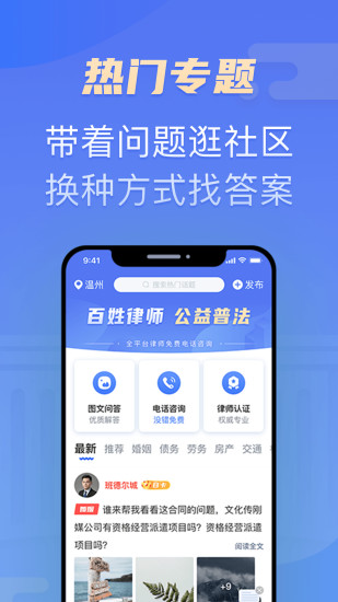 【社區(qū)】了解最新的法律咨詢,可以隨時隨地發(fā)布碰到的法律問題,海量專業(yè)律師在線為您解答。也可以發(fā)布生活動態(tài),與其他用戶一起分享您的喜和悲。