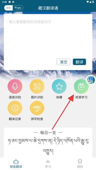 1、啟動(dòng)藏漢翻譯通APP,在首頁(yè)內(nèi)點(diǎn)擊雙語學(xué)習(xí)。