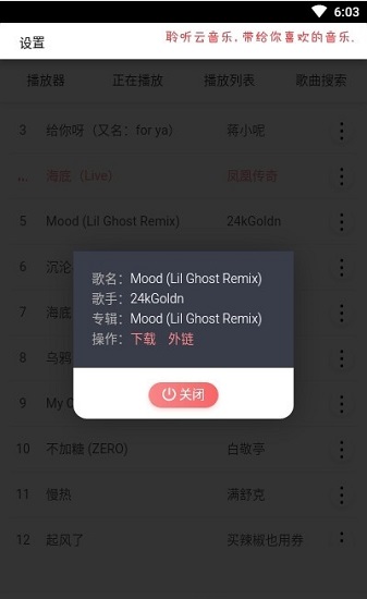 2、聆聽(tīng)云音樂(lè)擁有龐大、完整的曲庫(kù),歌曲更新迅速,試聽(tīng)流暢,口碑也很好。