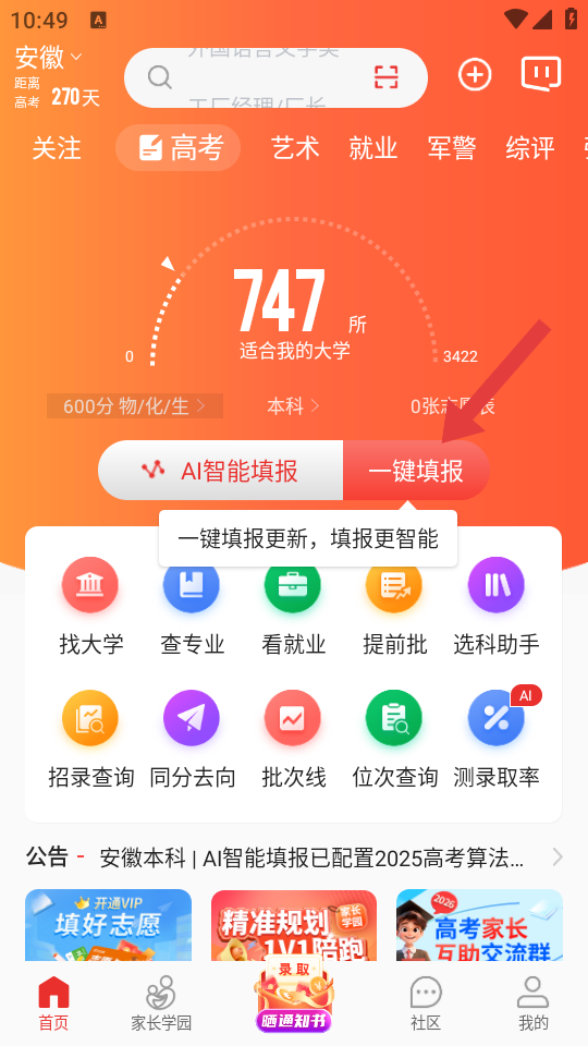 1、在優(yōu)志愿的首頁,點擊一鍵填報的按鈕,進入AI志愿生成的界面。