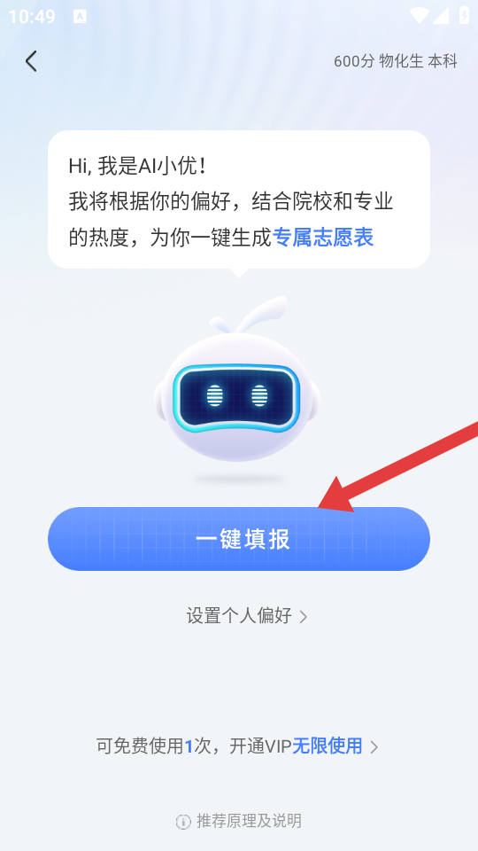 2、在AI小優(yōu)引導頁面,點擊一鍵填報按鈕,啟動志愿表生成的流程。
