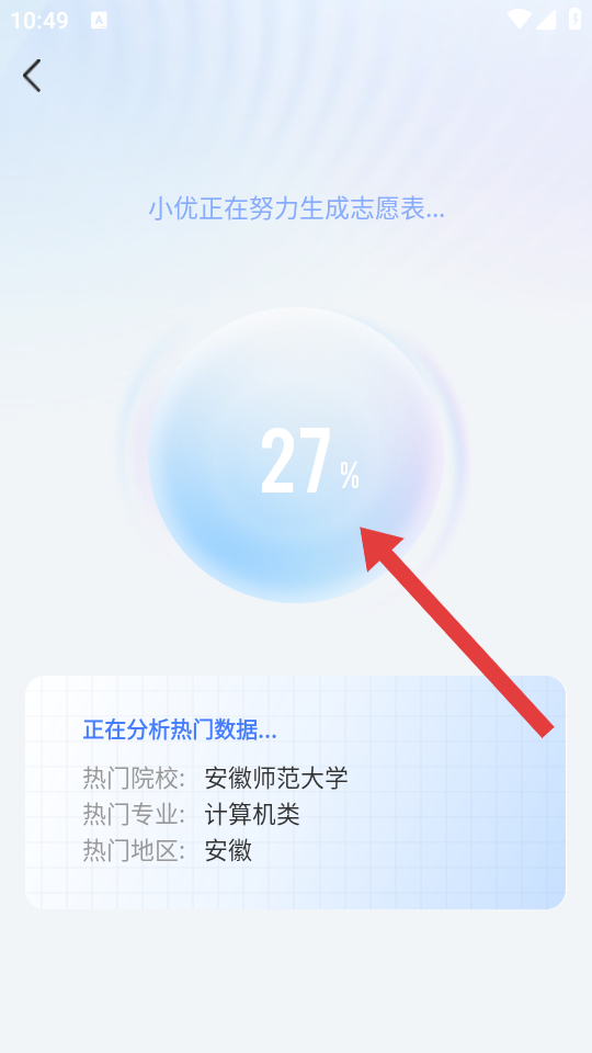 3、等待系統(tǒng)加載,頁面顯示小優(yōu)正在努力生成志愿表...及進度,同時可查看熱門院校、專業(yè)等數(shù)據(jù)。