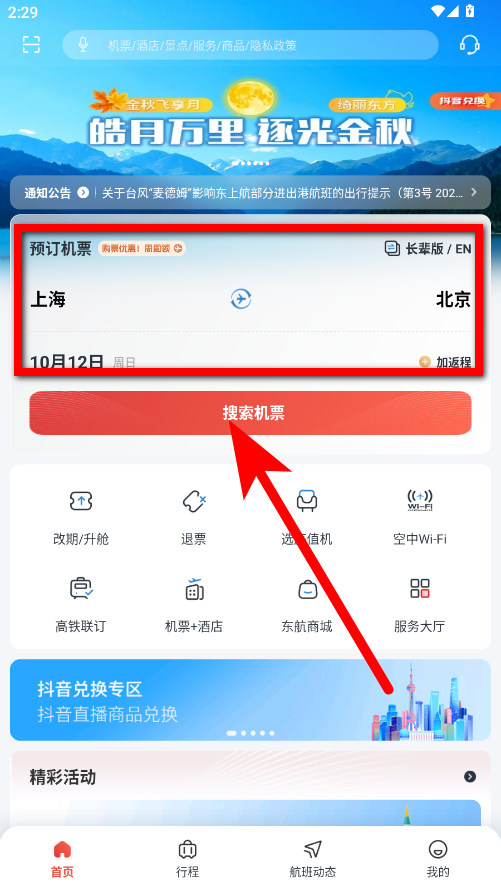 1、打開東方航空App,在首頁(yè)預(yù)訂機(jī)票欄中,輸入出發(fā)地如上海和目的地如北京,選擇出行日期,點(diǎn)擊搜索機(jī)票。
