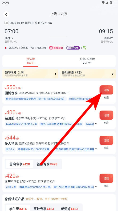 3、點(diǎn)擊所選航班進(jìn)入詳情頁(yè),查看艙位、退改簽規(guī)則等,確認(rèn)后點(diǎn)擊訂購(gòu)按鈕,按照后續(xù)提示完成支付等購(gòu)票操作。
