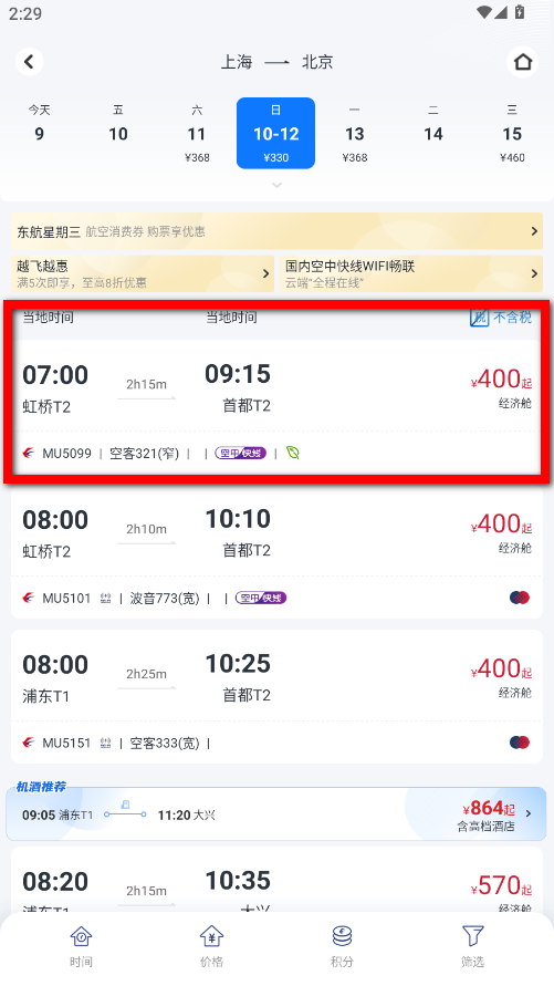 2、在搜索結(jié)果頁(yè)面,瀏覽各個(gè)航班的起飛時(shí)間、降落時(shí)間、價(jià)格等信息,選擇合適的航班。