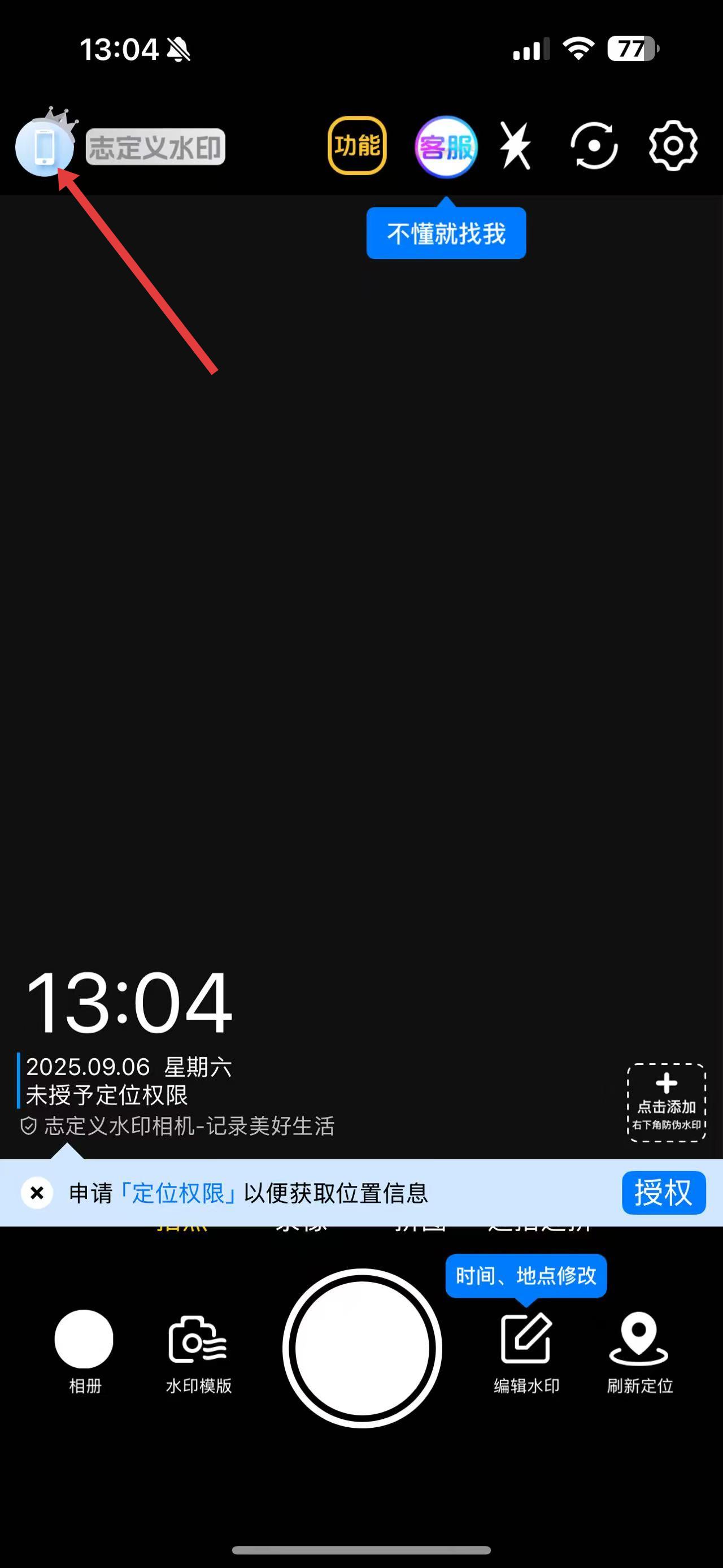 1、點(diǎn)擊自定義水印相機(jī)主界面左上角的圖標(biāo),進(jìn)入個人中心頁面。